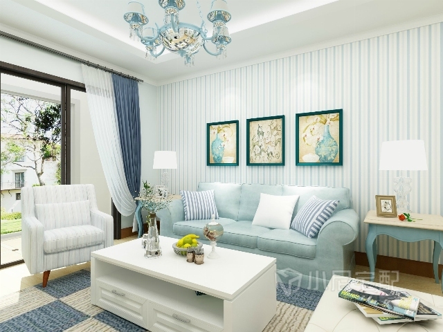 藍(lán)白條紋的壁紙與毛絨絨的條形地毯恰如波浪式的海面,帶給人們靜謐的情懷。