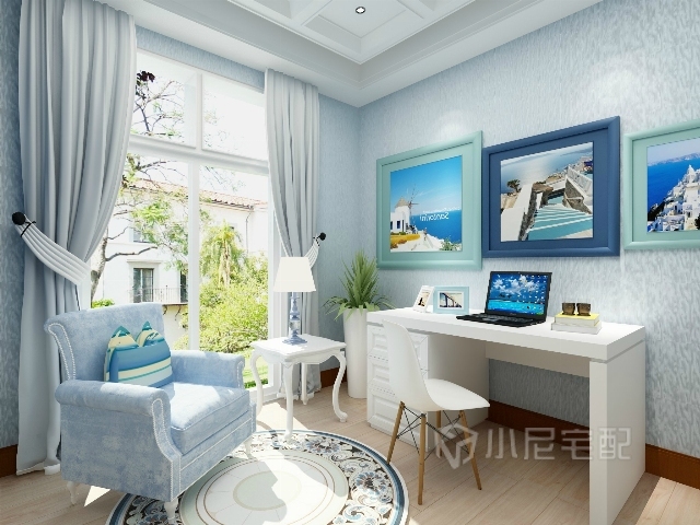 白色的書(shū)桌椅,藍(lán)色的沙發(fā),大幅的希臘風(fēng)景裝飾畫(huà),既浪漫又有學(xué)習(xí)工作的靜謐的氛圍。