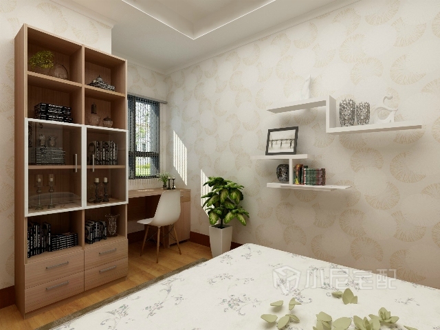在臥室的一角放上書桌和書柜,合理的利用房間的缺角。