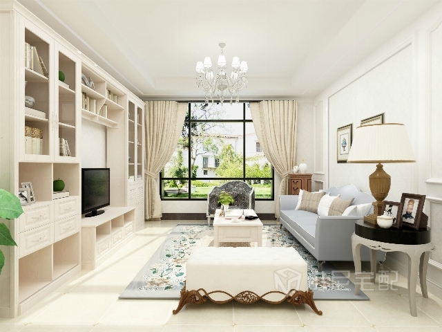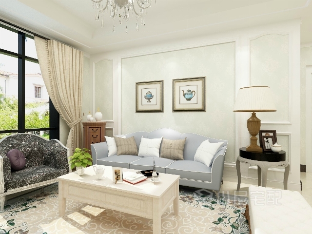 淡藍(lán)色的皮質(zhì)沙發(fā),優(yōu)雅的背景墻,帶有圖案的壁紙,地毯,窗簾,古典裝飾畫,體現(xiàn)簡歐的風(fēng)格。
