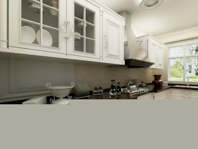 白色歐式櫥柜,黑色的石英石臺面耐臟耐磨。