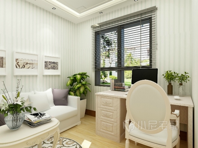 書房空間利用緊湊,書桌椅,沙發(fā),書柜,學(xué)習(xí)工作休閑融入一個空間。