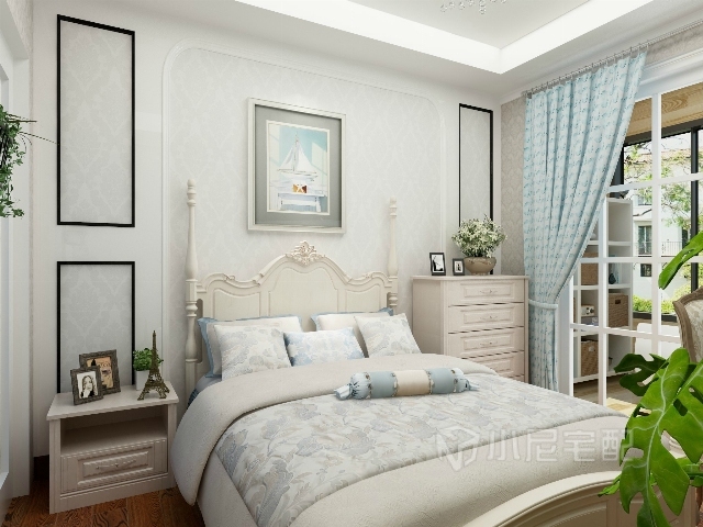 淡藍(lán)色的窗簾和背景墻相呼應(yīng),簡單的歐式線條穿插在簡約的空間設(shè)計之中,與配飾和諧相襯