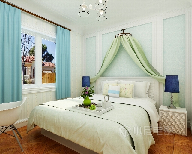 淡藍(lán)色的背景墻與窗簾相呼應(yīng),怡靜,自然。