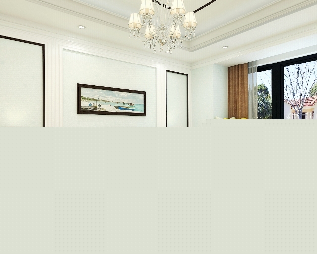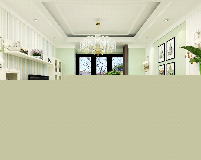 淡綠色的壁紙,既環(huán)保又養(yǎng)眼。歐式碎花沙發(fā),白色的茶幾和木飾面板,清新簡(jiǎn)潔自然。
