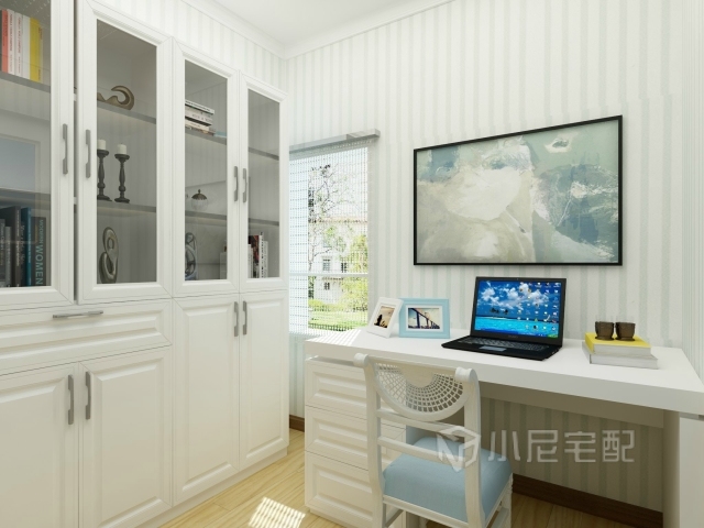書房選用白色的書柜和書桌椅,淡淡的色彩讓眼睛倍感舒適。