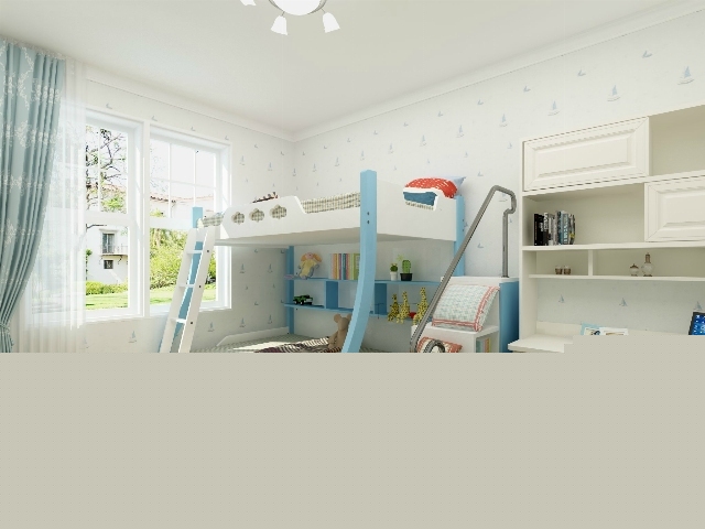 藍(lán)色的高低兒童床,轉(zhuǎn)角書桌,適合活潑好動的孩子。
