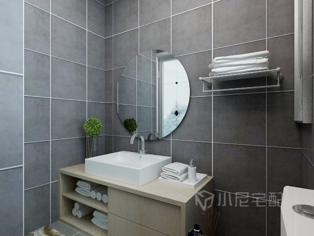 衛(wèi)生間的洗手柜采用的也是木色