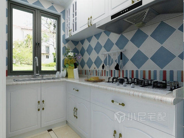廚房用仿古磚作為背景搭配櫥柜,有些偏地中海式的田園