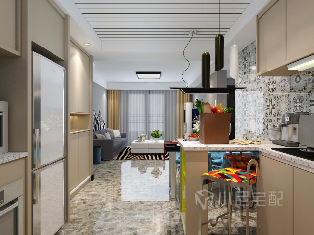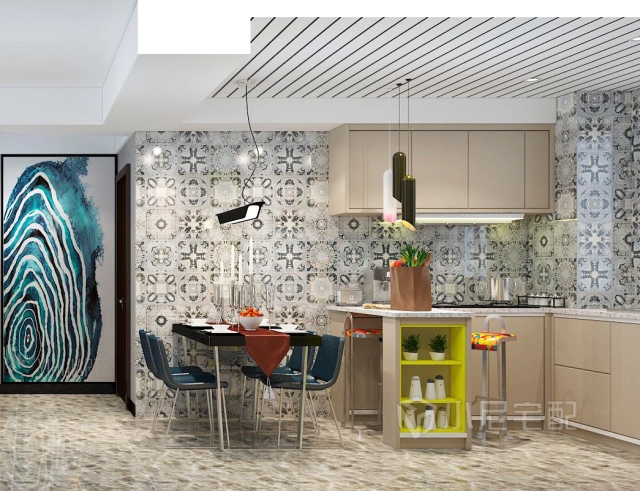 由于原始戶型廚房較小,所以經(jīng)過墻體拆改,將餐廳廚房,門廳搭配到一起,整體顏色搭配采用小尼地平線系列,與花磚形成強(qiáng)烈對比,使整個空間更溫馨,更出彩