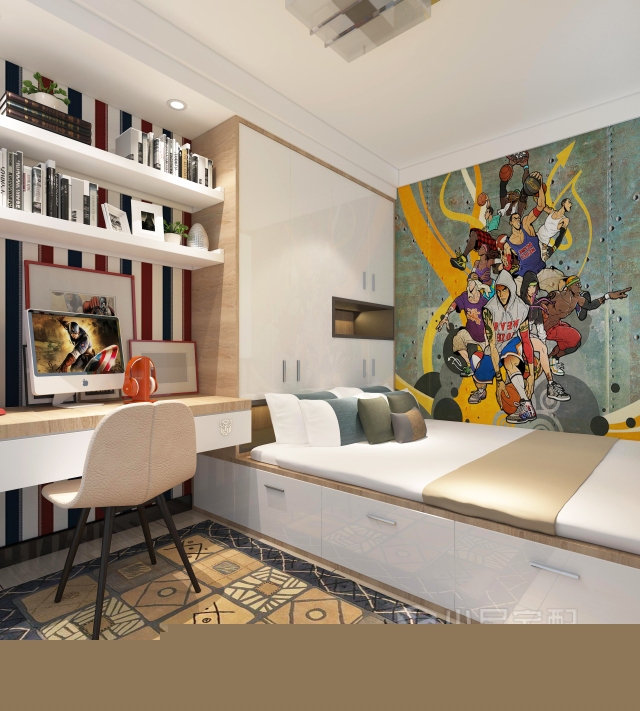 進(jìn)入臥室,背景墻采用深色壁紙,搭配淺色吊頂,亮光烤漆白衣柜,運(yùn)用顏色的對比,使空間更加清爽