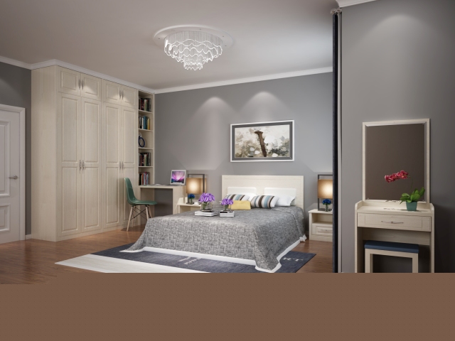 柔軟舒適的大床,多功能的衣柜,簡易的書桌,梳妝臺,一應(yīng)俱全