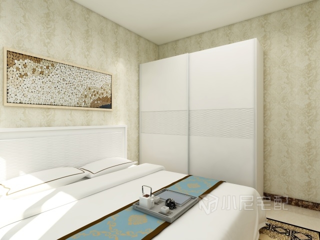 移門衣柜解決小戶型空間問題,床頭掛畫體現(xiàn)主人品味。