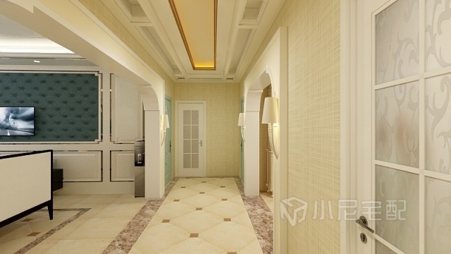 仿古鋪貼地面,深色仿古磚貼腳,暖色壁紙,搭配軟包背景墻,讓您舒適的同時,用眼前一亮。