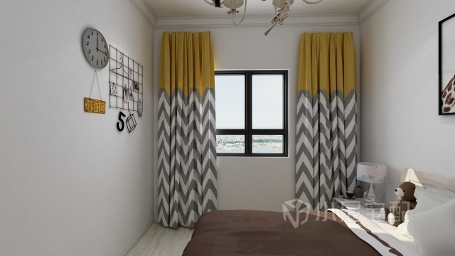 兒童房棕色床飾,配合黃黑相間窗簾,整個(gè)臥室立即活潑起來(lái)