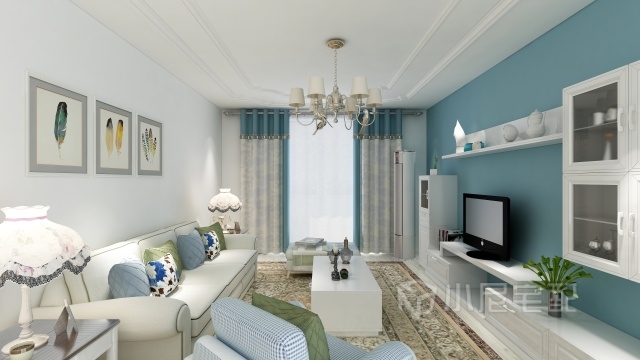 客廳定制白色簡(jiǎn)歐電視柜,配合藍(lán)色背景墻與藍(lán)白相間窗簾創(chuàng)造出一種清晰自然的感覺