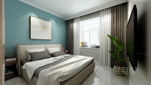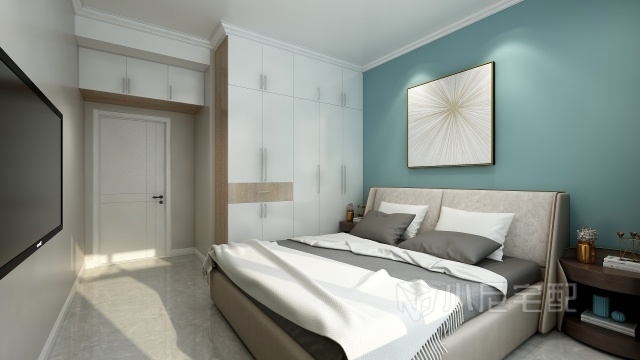 主臥以溫和的藍(lán)色為背景色,沒有多余繁瑣的線條,給人明凈清朗、如沐春風(fēng)的感覺。