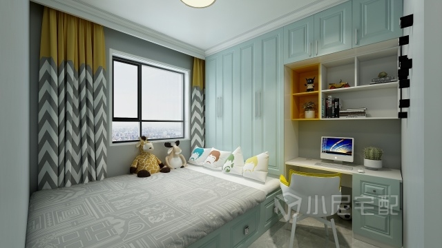 讓人放松的薄荷綠色,柔和的暖色燈光,再搭配玩偶的組合,兒童房進(jìn)一步強(qiáng)調(diào)溫暖恬靜的氛圍