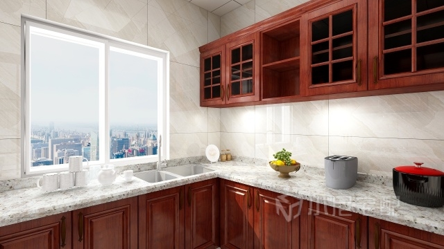 廚房空間比較大 可以2至3人來(lái)準(zhǔn)備可口的飯菜 玻璃的吊柜和開(kāi)放格更容易拿到你想要的餐具或調(diào)料 整體凸顯出層次感