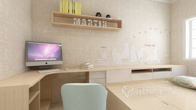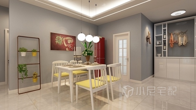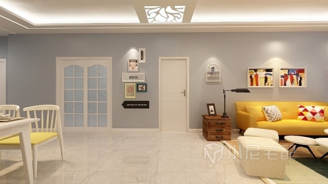 霧藍(lán)色的墻面遇見暖暖的黃色燈光,碰撞出不一般的顏色。