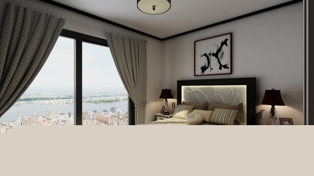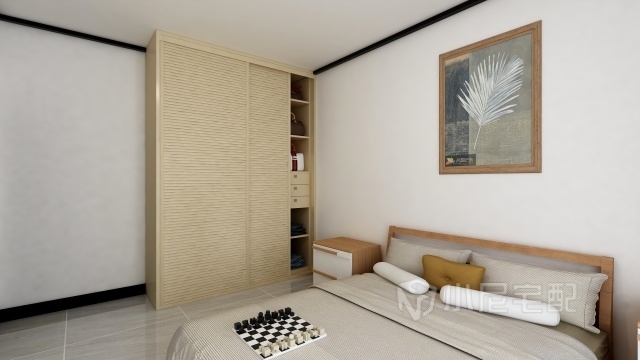 主臥整體顏色為黑白色,模仿徽派建筑的感覺,新中式的實(shí)木床,穩(wěn)重大氣