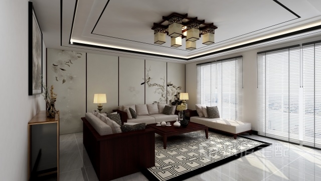 沙發(fā)背景以畫為墻,窗簾用卷簾,可以從視覺上增加客廳的面積。實(shí)木軟靠沙發(fā)更顯檔次