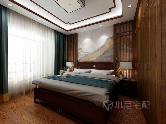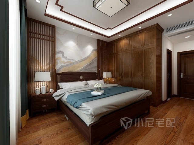 主臥室的背景墻用木質(zhì)的花格搭配抽象圖案的壁畫,讓空間具有了視覺焦點。