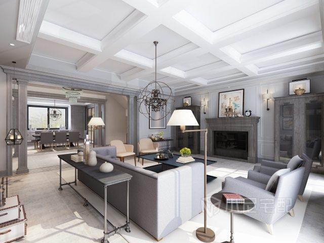 客廳,淡色系墻面、天花板、沙發(fā)與深色系的家具、掛畫相得益彰,賦予空間平衡之美