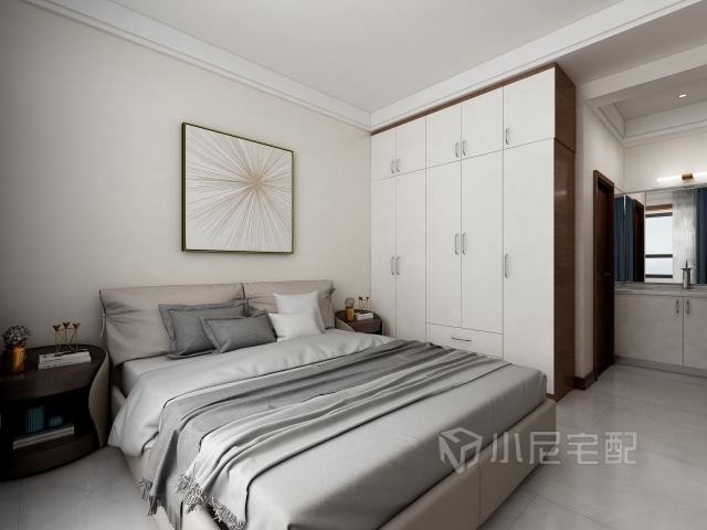 選用象牙墻面選用灰色被子,灰色的床,經(jīng)典的灰白搭配,低調(diào),沉穩(wěn),大方