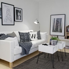 這套案例很有北歐瑞典風情,全屋選用白色為主色調(diào),讓空間增加寬敞感。家具幾乎全部為黑白(灰)搭配,對比效果明顯。家具造型簡單,突出硬朗的線條,給人干凈利落的感覺,突出主人時尚的生活品味。白色給人潔凈明朗的感覺,同時還能增強空間感??蛷d配備了充足的燈飾,采光條件極好。簡單的沙發(fā),特色小茶幾,組合黑白相框,讓客廳充滿時尚個性。