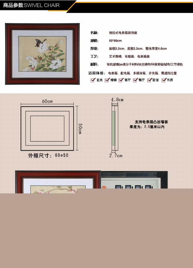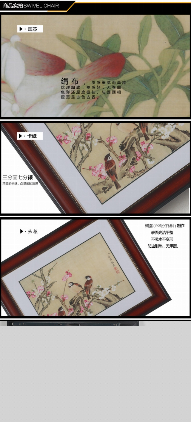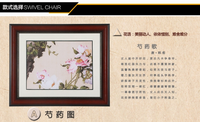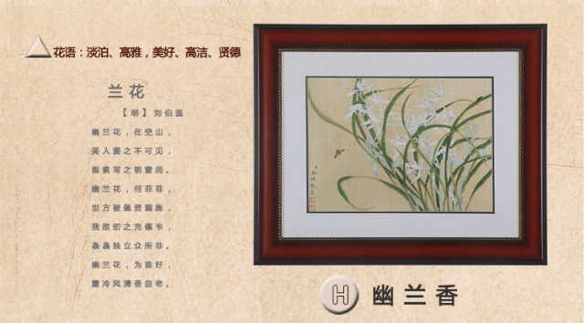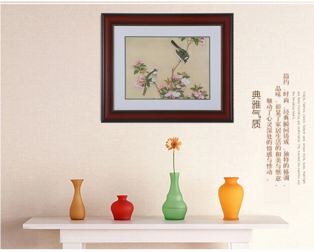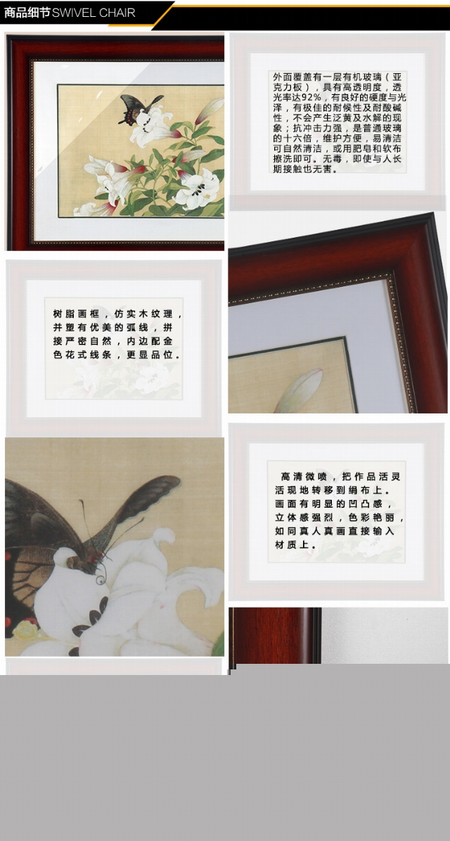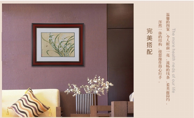 樹脂畫框,仿實木紋理,并塑有優(yōu)美的弧線,拼接嚴密自然,內(nèi)邊配金色花式線條,更顯品位。