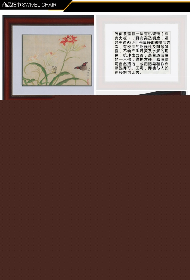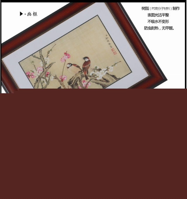 樹脂畫框,仿實(shí)木紋理,并塑有優(yōu)美的弧線,拼接嚴(yán)密自然,內(nèi)邊配金色花式線條,更顯品位。