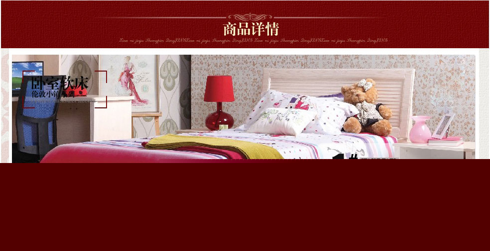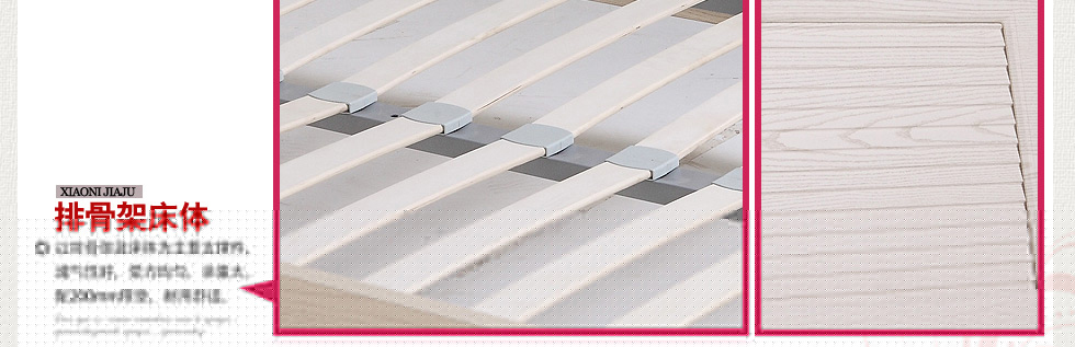 | 規(guī)格 | 床頭:270*128*927mm 床體:2035*1260*323mm 床墊:1200*2000*200mm 排骨架:1200*2000*50mm 衣柜:908*533*2075mm 字臺:1200*1080*1995mm 床頭柜:558*401*448mm |