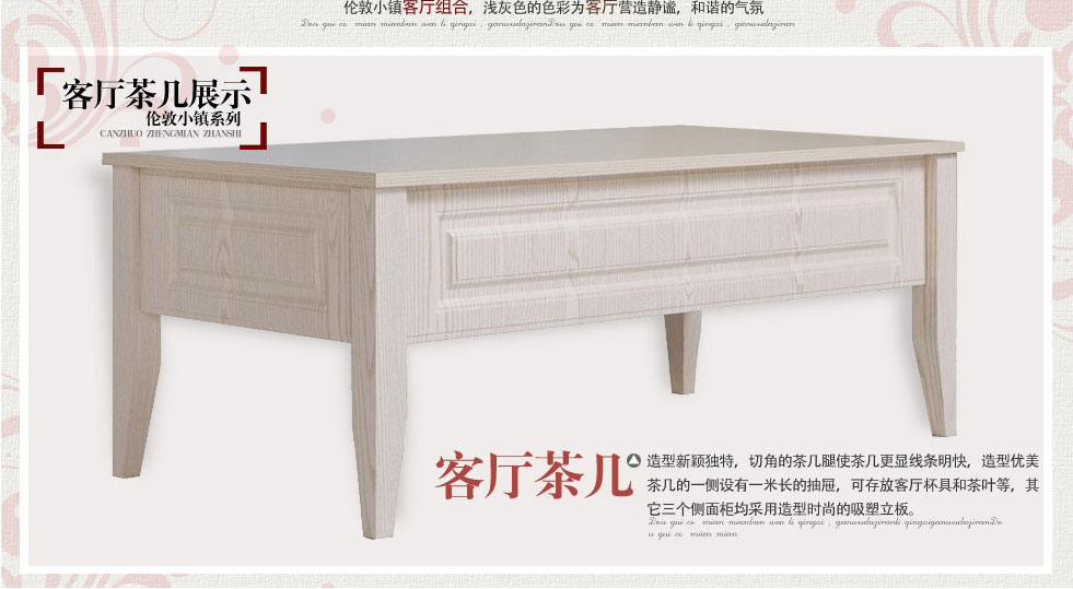 | 細(xì)節(jié)描述 | 客廳柜干凈利落的線型,古典的紋理將英倫色彩完美演繹加上通透的玻璃門(mén),勾勒出家具的風(fēng)韻與格調(diào);茶幾造型新穎獨(dú)特,切角的茶幾腿使茶幾更顯線條明塊,造型優(yōu)美;間廳柜在起到分割的作用的同時(shí),其文雅的線條和時(shí)尚的造型也起到了裝飾作用;沙發(fā)是根據(jù)人體學(xué)設(shè)計(jì),扶手端正,坐感舒適,不易疲乏,支腳采用優(yōu)質(zhì)五金,配膠墊,防劃傷地板。 |