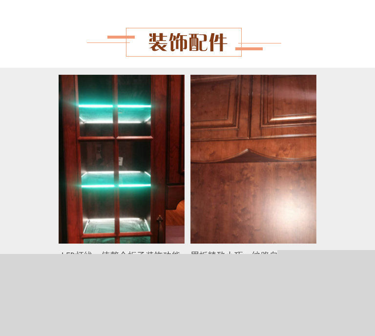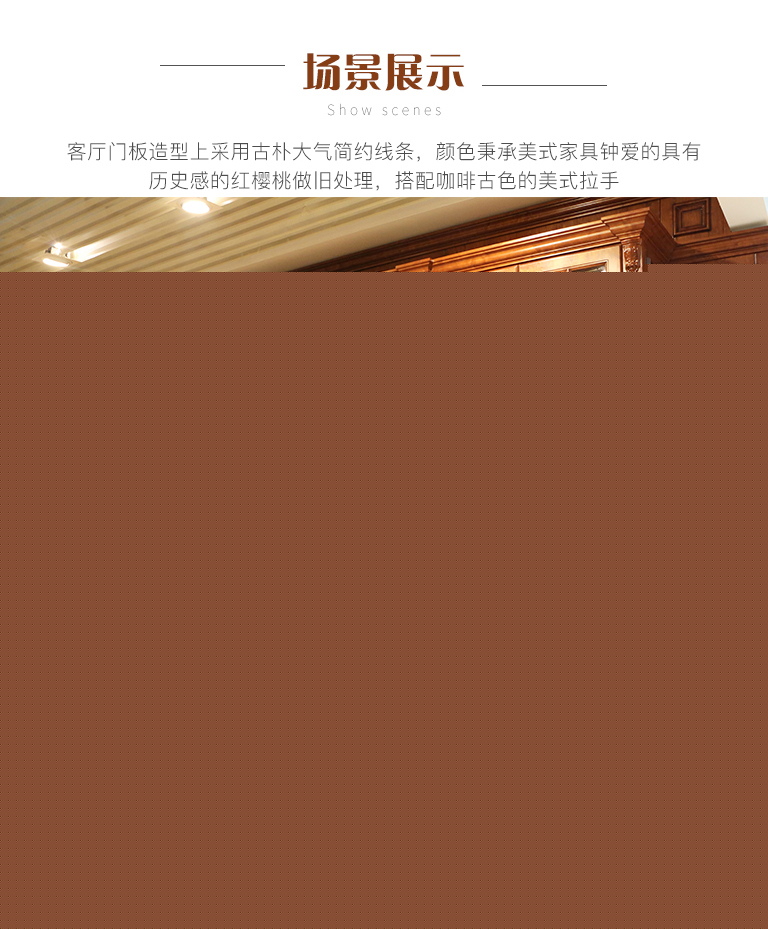 | 細(xì)節(jié)描述 | 客廳門板造型上采用古樸大氣簡約線條,顏色秉承美式家具鐘愛的具有歷史感的紅櫻桃做舊處理,搭配咖啡古色的美式拉手。注重黃金比例設(shè)計,巧妙的柜體結(jié)構(gòu)形成對稱,強調(diào)家具帶給人的平和感,并且把現(xiàn)代的功能納入其中,裝飾效果好,穩(wěn)定性強,儲物更加方便。 |