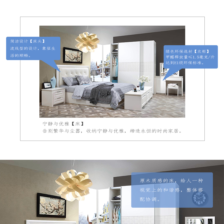 | 規(guī)格 | 外掛門(mén)衣柜:2000×605×2250mm、床頭柜:552×400×477mm、軟床:2103×1910×360mm、床墊:1800×2000×260mm、臥房電視柜:1880×450×415mm、妝臺(tái):1100×400×760mm、妝凳:400×300×420mm |